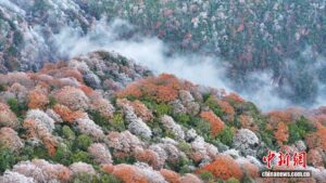 جبل فانجينغ في قويتشو: أشجار متجمدة وأوراق خريف ملونة تخلق مشهداً خلاباً