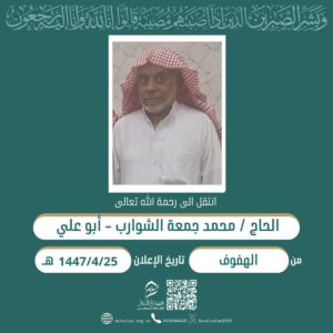 انتقل إلى رحمة الله تعالى الحاج “محمد جمعة الشوارب – أبو علي”. وسيشيع جثمانه الطاهر…
