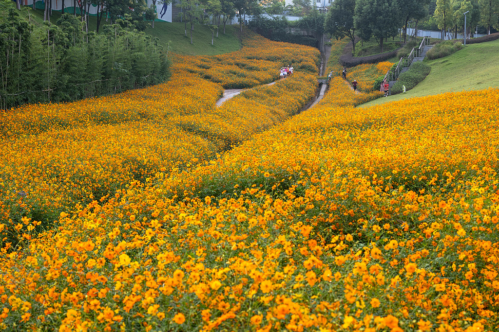 Mexican sunflowers bloom at the Ganlanxi Sports Park in Chongqing, covering the ground like a golden carpet.
