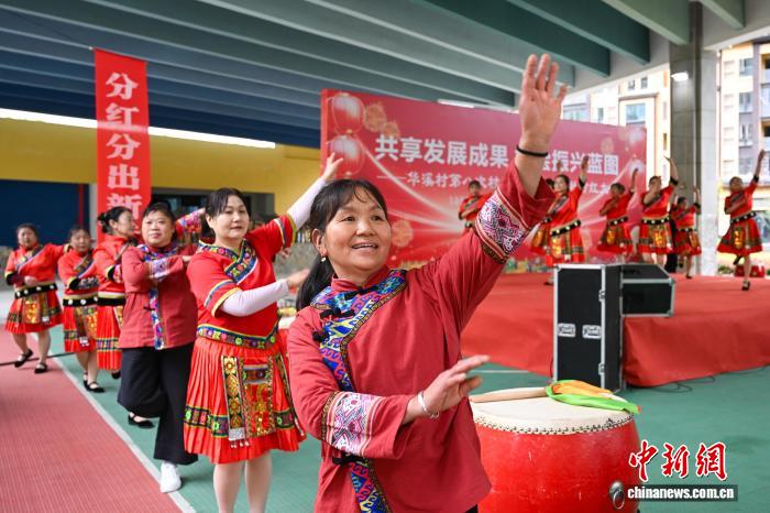During the cultural performance segment of the dividend distribution event, local residents perform the Tujia Hand-Waving Dance together.