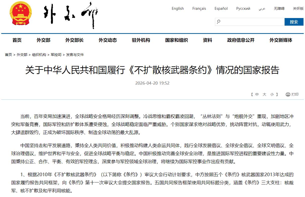 4. The Chinese government has always advocated for the complete prohibition and thorough destruction of nuclear weapons and supports the international community in advancing the goal of nuclear disarmament step by step under the principles of “maintaining global strategic stability” and “undiminished security for all.” China adheres to the policy of no-first-use of nuclear weapons, pursues a self-defensive nuclear strategy, does not engage in nuclear arms races with any country, maximizes nuclear transparency on the basis of not compromising national security, actively promotes measures to reduce nuclear risks, and makes due contributions to achieving the ultimate goal of a nuclear-weapon-free world.