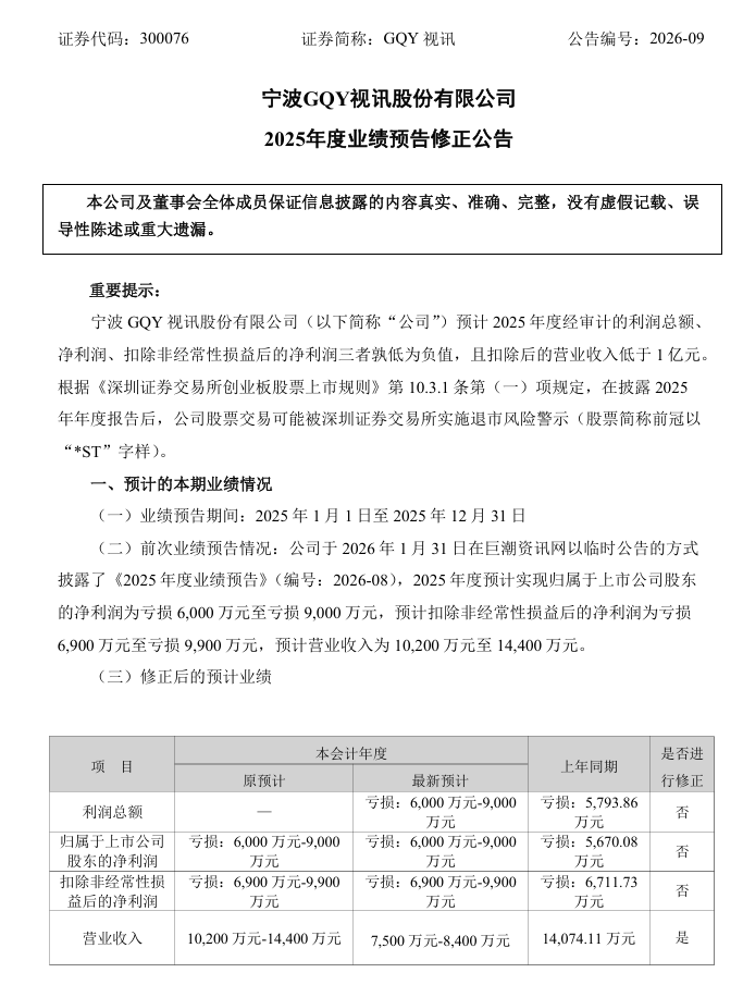 GQY Video issued an announcement stating that it expects a net loss attributable to shareholders of the listed company for 2025 to be between 60 million and 90 million yuan. The reason for the performance change is that subsidiaries are excluded from the consolidated financial statements, and the accounting for some businesses has been adjusted from the gross method to the net method, leading to a revised operating revenue of 75 million to 84 million yuan. The revenue after deductions is below 100 million yuan. The company expects that the lowest value among the audited total profit, net profit, and net profit after deducting non-recurring gains and losses for 2025 will be negative, and the revenue after deductions will be less than 100 million yuan.