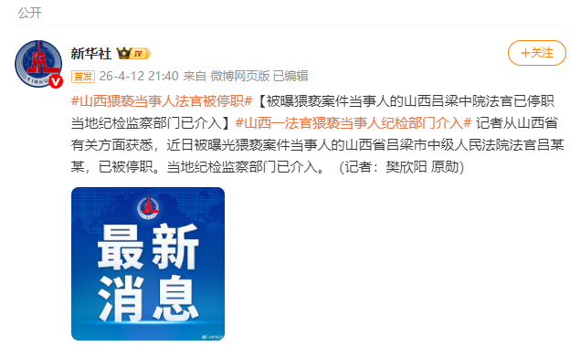 According to Xinhua News Agency, the judge from the Lüliang Intermediate People’s Court in Shanxi Province, who was recently exposed in an indecent assault case, has been suspended. Local discipline inspection and supervision authorities have intervened.