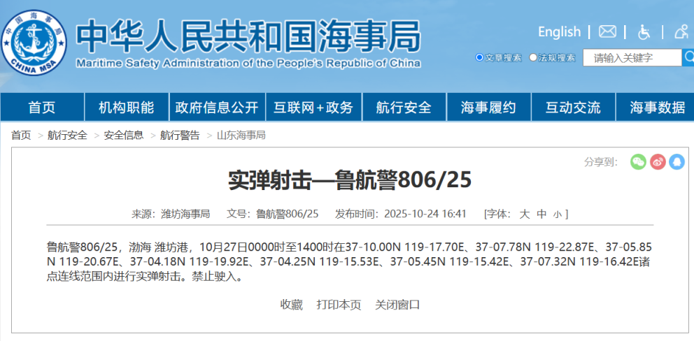 According to the maritime authority website, Weifang Maritime Safety Administration has issued a navigation warning. From 00:00 to 14:00 on October 27th, live-fire exercises will be conducted in certain waters of the Bohai Sea near Weifang Port, and entry is prohibited.