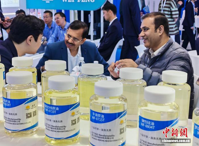 The 25th China International Dye Exhibition opened in Shanghai on April 15. The photo shows overseas buyers negotiating with exhibitors at the event.