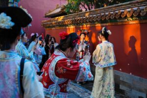 Touristen tragen im Kaiserpalast Kleidung als „Prinzessinnen“ und „Kaiserinnen“ und tauchen in östliche Ästhetik ein.