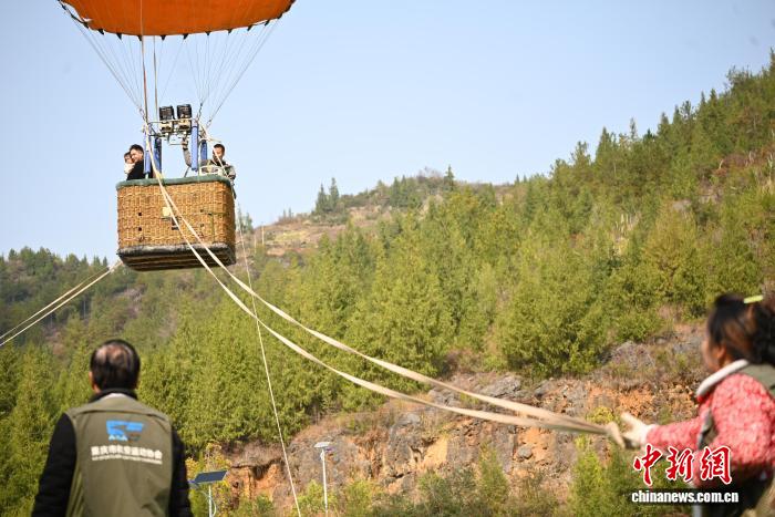 „Ignition, one, two, three, lift off!“ At the tethered hot air balloon launch site in Xiao Jia Chong, staff operate the equipment, leading tourists to enjoy views of the Lesser Three Gorges, forested mountains, and red foliage. The on-site manager stated the project has three professional pilots and several local villagers serving as ground crew, capable of operating two balloons for takeoff and landing simultaneously.