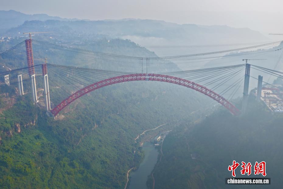 Am 27. November wurde der Stahlfachwerkbogen der Fenglai-Daxi-Flussbrücke an der Schnellstraße von Chongqing Wulong zum Bezirk Liangjiang New Area erfolgreich geschlossen. Mit einer Hauptspannweite von 580 Metern ist sie die größte Stahlbogenbrücke der Welt. Die Brücke erstreckt sich über eine Gesamtlänge von 1.136,7 Metern und wurde als stählerne Deckbrücke mit Stahlkastenfachwerk konzipiert. Sie befindet sich in der steilen, tief eingeschnittenen Canyonlandschaft des Bezirks Wulong. Die Fahrbahn liegt mehr als 310 Meter über der Flussoberfläche – vergleichbar mit der Höhe eines 100-stöckigen Hochhauses. Für den vollständig stählernen Bau wurden insgesamt 25.000 Tonnen Stahl verbaut. Das Bild zeigt die Fenglai-Daxi-Flussbrücke im Bau.