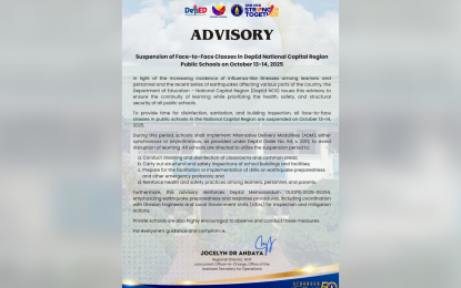 In einer am Sonntag veröffentlichten Mitteilung nannte DepEd NCR die steigende Zahl grippeähnlicher Erkrankungen unter Schülern und Schulpersonal sowie die jüngste Serie von Erdbeben in verschiedenen Landesteilen als Gründe für die zweitägige Aussetzung.