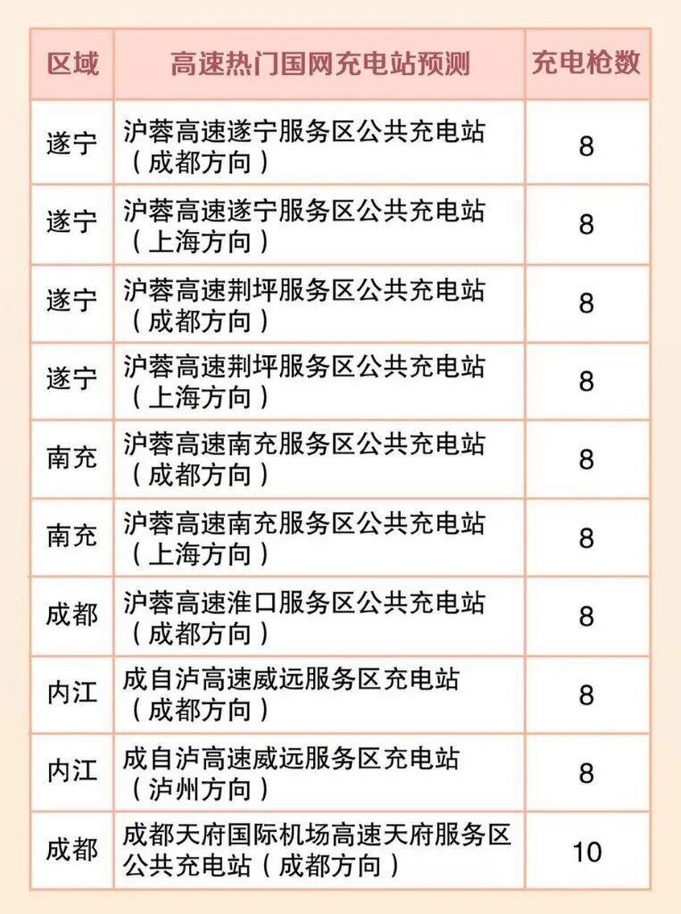 Además, se espera que las siguientes estaciones de carga de la Red Eléctrica en las autopistas dentro de la Provincia de Sichuan estén particularmente concurridas. Los conductores que pasen por estas áreas deben prestar especial atención.