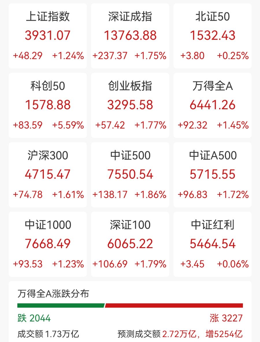Los tres principales índices de acciones A subieron colectivamente en la sesión de la mañana. Hasta el mediodía, el Índice Compuesto de Shanghái ganó un 1.24%, superando los 3900 puntos por primera vez en 10 años; el Índice de Componentes de Shenzhen subió un 1.75%, el Índice ChiNext aumentó un 1.77% y el Índice de la Bolsa de Valores de Beijing 50 avanzó un 0.25%. El volumen de negociación combinado en los mercados de Shanghái, Shenzhen y Beijing alcanzó los 1.7269 billones de yuanes en la sesión de la mañana, expandiéndose en 357.100 millones de yuanes respecto al día anterior. 3200 acciones subieron en todo el mercado.