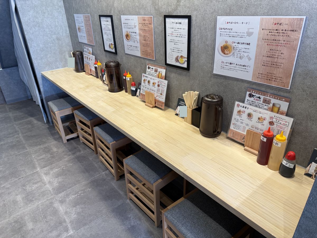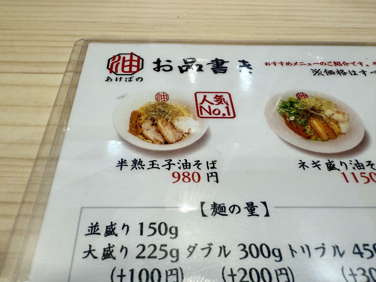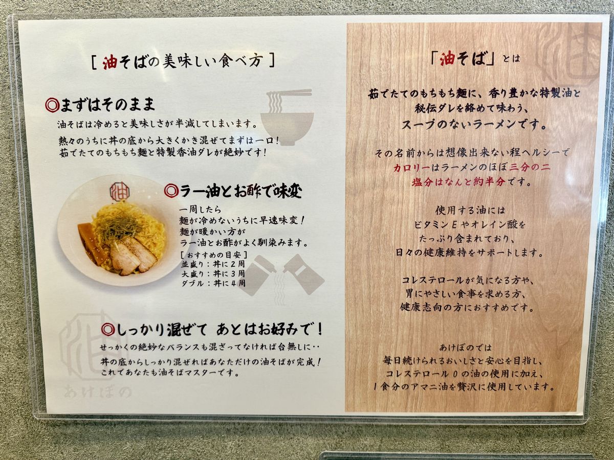 Hay asientos en la barra en la parte delantera del local.También hay asientos en la barra en la parte trasera.Más adentro, hay dos mesas para dos personas y una mesa para cuatro.Esta es la carta de ‘Abura Soba Akebono Kaiyukan Osaka Minato Store’.¡Esta vez pedimos el ‘Hanjuku Tamago Abura Soba’ (Fideos al huevo pochado)!