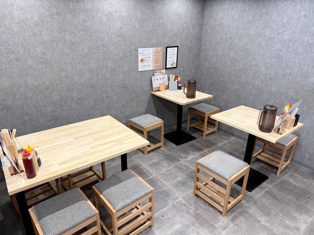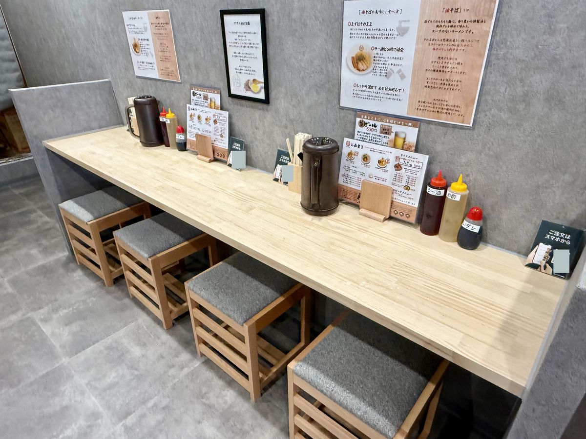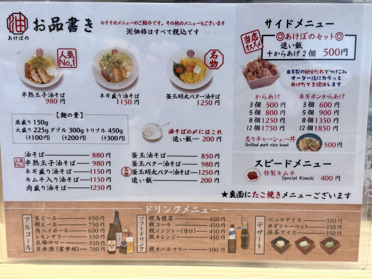 Hay asientos en la barra en la parte delantera del local.También hay asientos en la barra en la parte trasera.Más adentro, hay dos mesas para dos personas y una mesa para cuatro.Esta es la carta de ‘Abura Soba Akebono Kaiyukan Osaka Minato Store’.¡Esta vez pedimos el ‘Hanjuku Tamago Abura Soba’ (Fideos al huevo pochado)!
