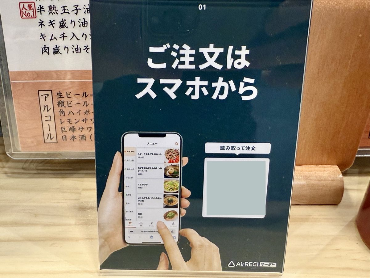 En ‘Abura Soba Akebono Kaiyukan Osaka Minato Store’, el sistema de pedidos consiste en escanear un código QR colocado en cada asiento de la barra y mesa con un smartphone para realizar el pedido.¡Estos son los ‘Hanjuku Tamago Abura Soba’!