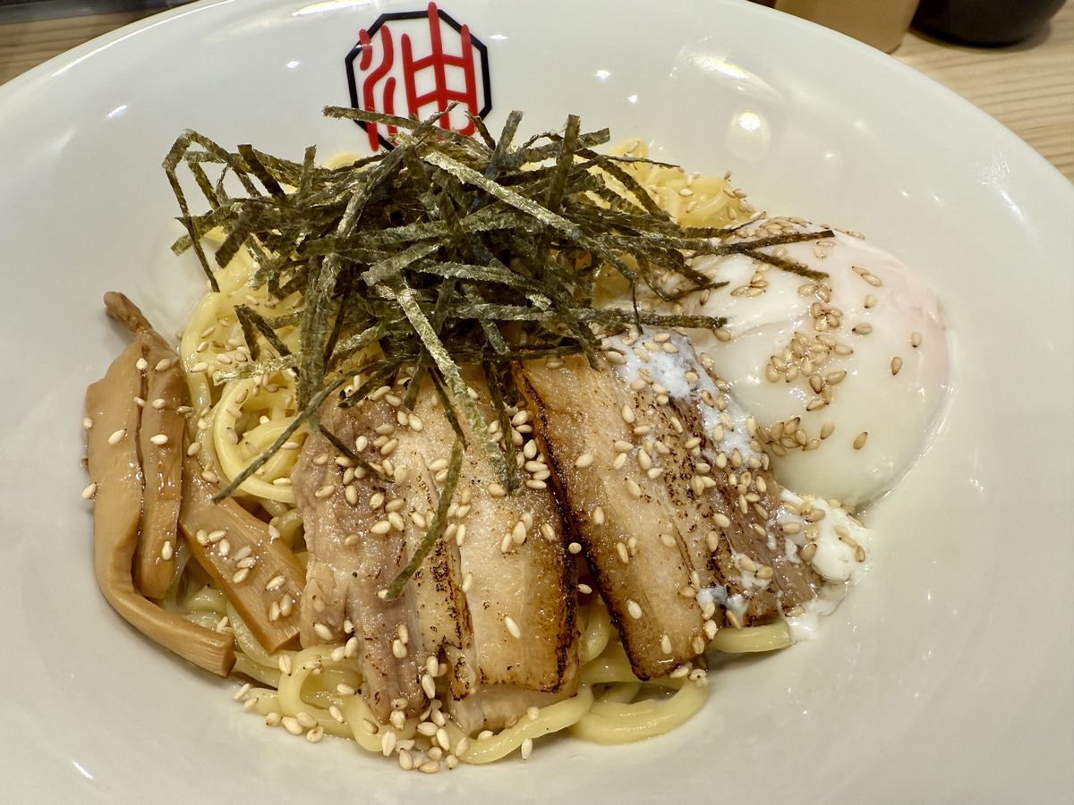 El ‘Hanjuku Tamago Abura Soba’ está cubierto con cerdo chashu, brotes de bambú menma, algas nori desmenuzadas, semillas de sésamo blanco y un huevo pochado.