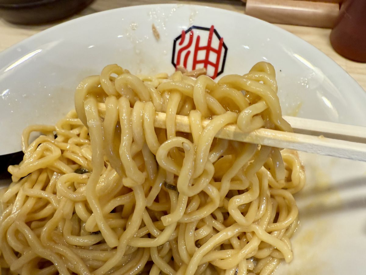 ¡La textura masticable de los fideos gruesos combinaba bien con la salsa especial, y el huevo pochado añadía un sabor suave y aterciopelado!También puedes personalizar el sabor a tu gusto con aceite de chile, vinagre o salsa extra.