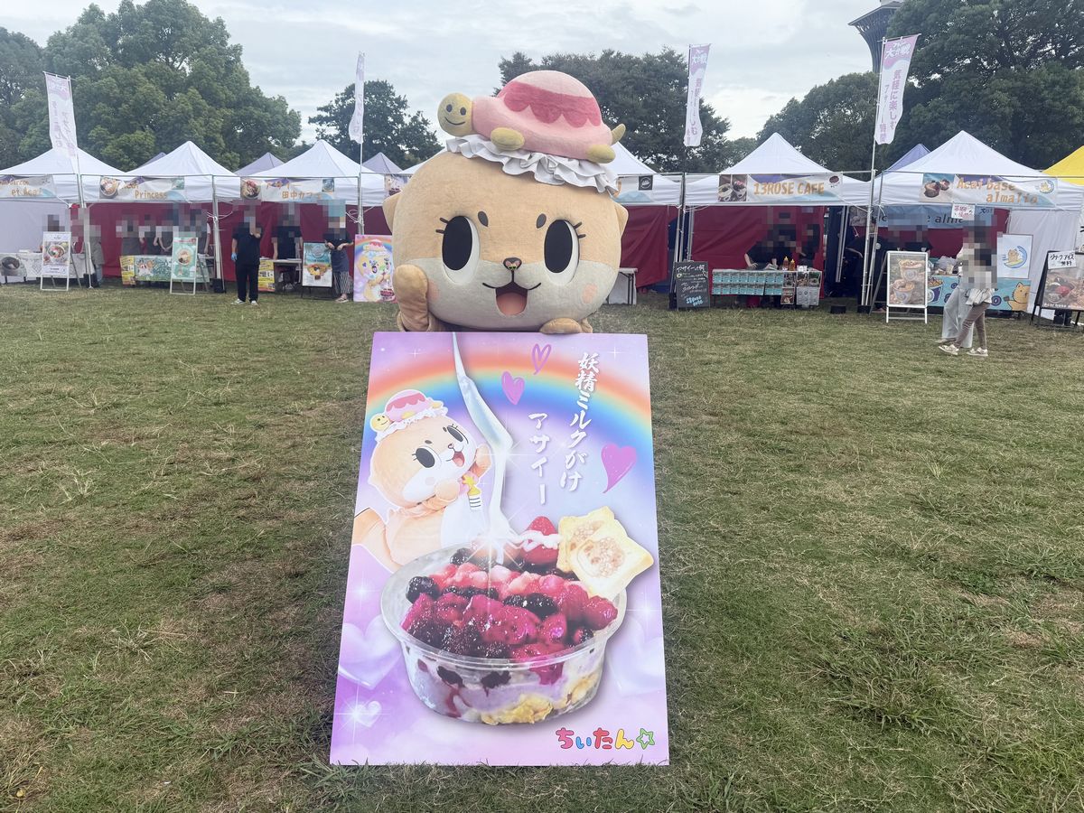 ¡Este es el roux de curry negro y el arroz de «One Spoon»!El roux tiene un picante moderado mientras ofrece un rico sabor especiado y umami.¡Viértelo generosamente sobre el arroz!Esta es la zona de la «Gran Guerra del Açaí VS Gran Batalla del Açaí».Para nuestra sorpresa, ¡ese día el popular personaje «Chii-tan☆» vino a animar desde el puesto «Chii-tan☆ Açaí»!
