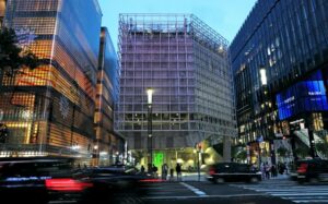 La fachada moderna de hormigón visto llama la atención. Ginza Sony Park abrió sus puertas…