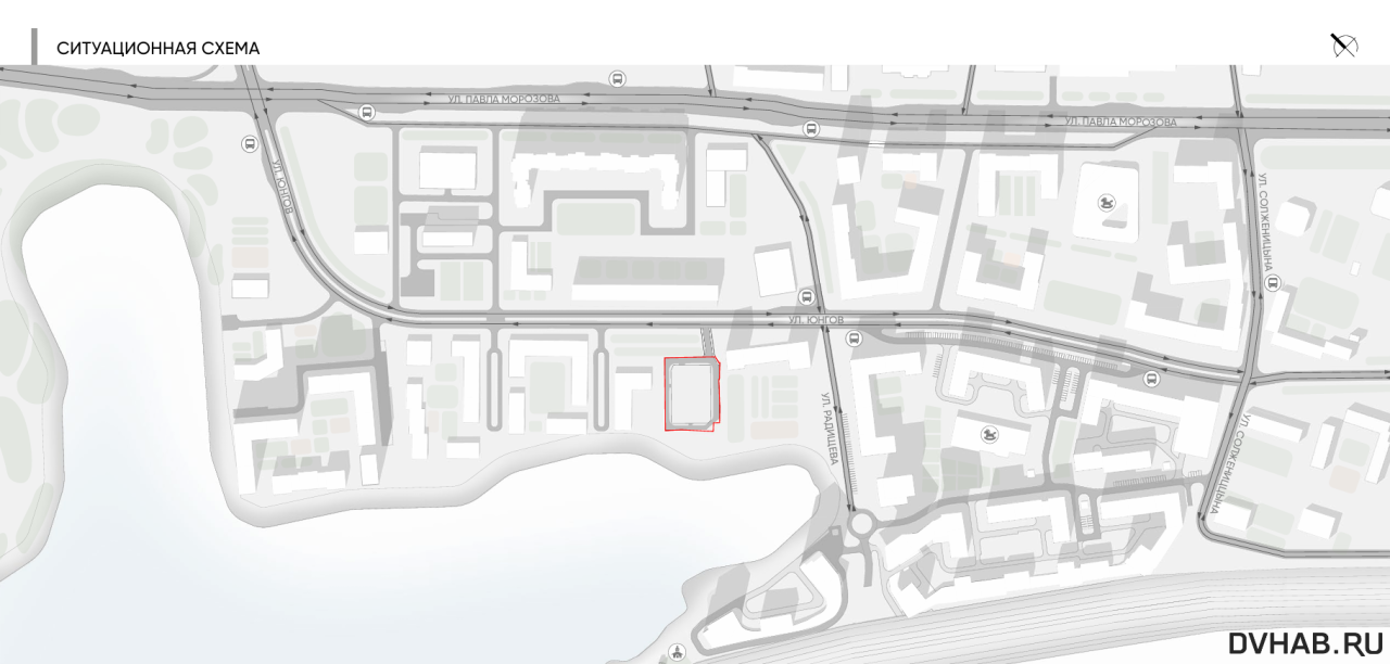Anteriormente, el hotel «Khabarovsk-City» se mostraba en ubicaciones diferentes en los planos, cerca de la estación fluvial, con una altura de 111 metros. Ahora ha sido trasladado justo al lado del único edificio residencial en este rincón del canal (un edificio de diez plantas en Yungov, 12). La altura del edificio se ha vuelto más modesta: solo 87 metros. Esto probablemente se deba a que los edificios de más de cien metros de altura están sujetos a normativas más estrictas en el país, y el promotor no quiso lidiar con eso.