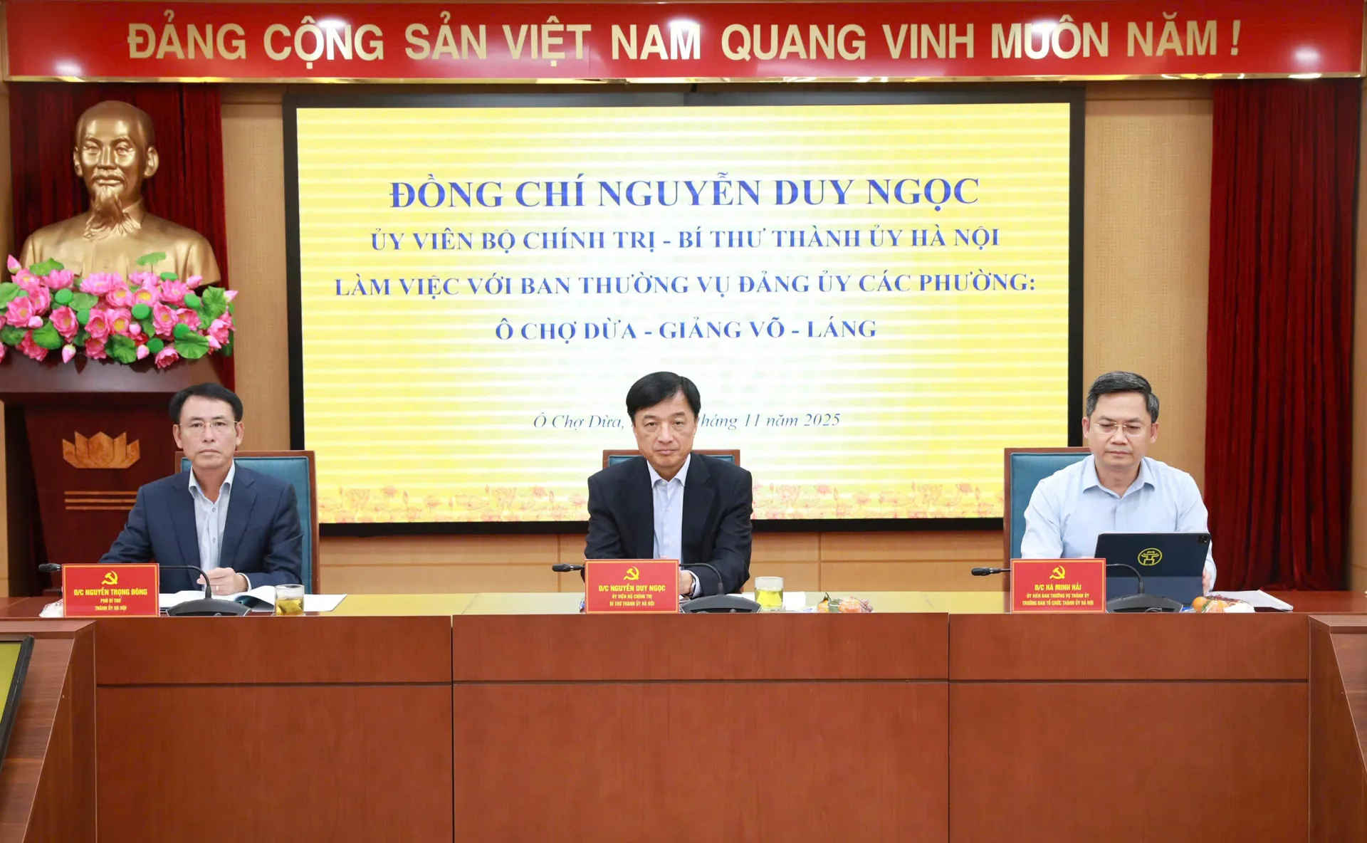 En la tarde del 27 de noviembre, el Secretario del Comité del Partido de Hanói presidió una sesión de trabajo con los Comités Permanentes de los Comités del Partido de los distritos en relación con la construcción del Partido, el desarrollo del sistema político, la situación de desarrollo socioeconómico, la garantía de la defensa nacional y la seguridad de las localidades, y los trabajos de despeje de terrenos para la Carretera de Circunvalación 1 (el tramo Hoang Cau – Voi Phuc).
