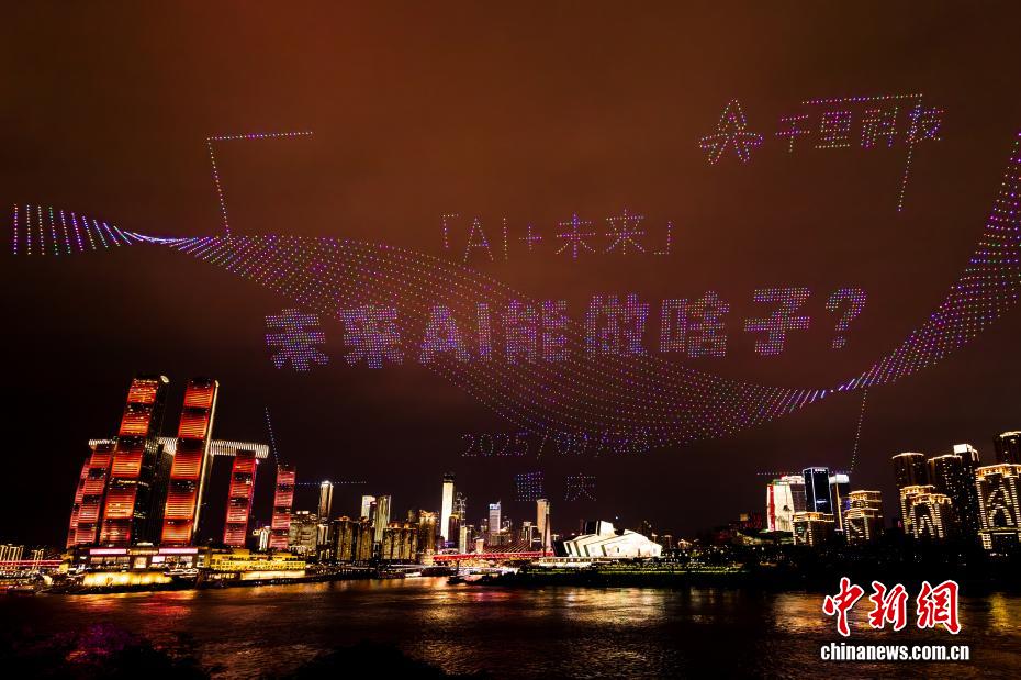 Le 28 septembre a eu lieu le « Nouveau Rime Chongqing – Événement de Lancement du Parcours Intelligent de Mille Li et de la Nuit de Conduite Intelligente IA ». Lors de cet événement, 5 000 drones ont utilisé le ciel nocturne comme toile, avec en toile de fond la zone des Deux Rivières et Quatre Rives de Chongqing, pour dépeindre des scènes vivantes de « l’IA+le Futur ». L’image montre la flotte de drones esquissant la vision « IA+Futur ».