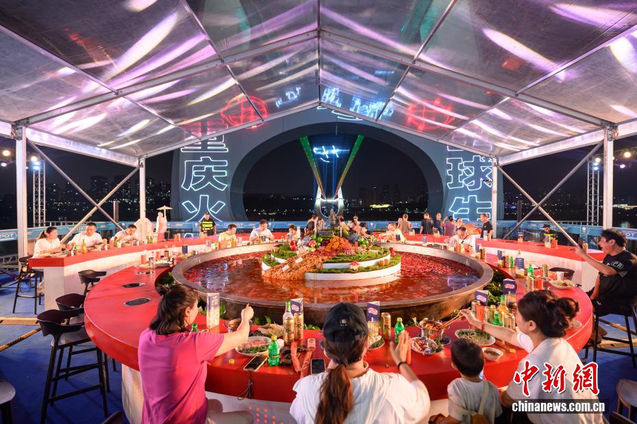 Le soir du 28 septembre, l’édition 2025 de la Saison de la Consommation de Services de Chongqing et du 17e Festival Culturel de la Gastronomie du Hot Pot de Chine (Chongqing) a été lancée sur la plateforme d’observation du pont de Baijusi sur le Yangtsé, dans le district de Dadukou, à Chongqing. Ce festival du hot pot, placé sous le thème « Le Parfum du Hot Pot de Chongqing se Répand dans le Monde », a non seulement proposé un banquet de hot pot de 1,2 kilomètre le long de la rivière, mais a également présenté un « super hot pot » de 10 mètres de diamètre. Combiné à un spectacle laser sur le pont, il a offert aux citoyens et aux visiteurs une expérience immersive de hot pot mêlant vues nocturnes sur la rivière, cuisine authentique et technologie futuriste. La photo montre des citoyens expérimentant le « super hot pot » sous le pont de Baijusi sur le Yangtsé.