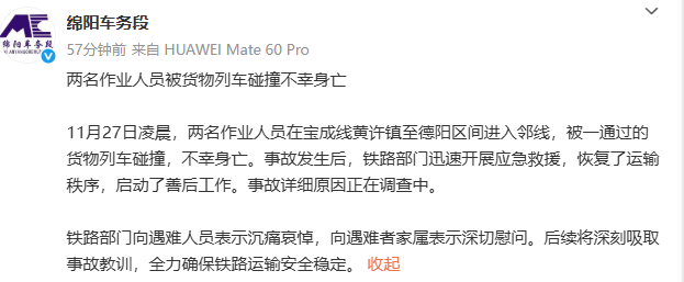 Le soir du 27 novembre, la section ferroviaire de Mianyang a publié un rapport indiquant que deux ouvriers avaient malheureusement trouvé la mort après avoir été heurtés par un train de marchandises.