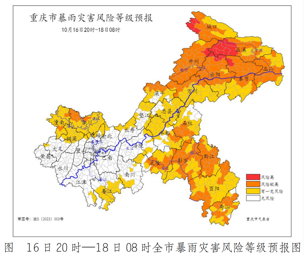 Le 15 octobre, le Bureau météorologique de Chongqing a émis une alerte de niveau IV pour risque de catastrophes liées aux pluies diluviennes. En raison de l’influence combinée des courants d’air chauds et humides du sud-ouest et de l’air froid, le temps pluvieux à Chongqing devrait persister jusqu’au 20. Un épisode de fortes pluies est prévu de la nuit du 16 au soir du 17, avec des pluies fortes à très fortes dans la partie nord de la région occidentale et les zones orientales, et des averses localisées violentes (précipitations accumulées de 40 à 90 mm, localement 120 à 150 mm). Les autres zones connaîtront des pluies modérées à fortes, avec des précipitations horaires maximales de 30 à 50 mm. Du 16 au 20, la température moyenne quotidienne dans la plupart des zones baissera de 5 à 8°C.