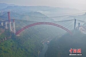 Le plus grand pont en arc d’acier au monde referme sa travée principale sur la rivière Daxi à Fenglai