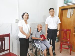 Mei Zutang, an elderly man, holds a commemorative medal with a smile on his face.…