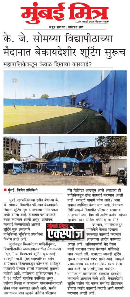 Illegal film shooting has been reported on the grounds of K. J. Somaiya University, which falls within the jurisdiction of the Mumbai Municipal Corporation. A complaint was filed with the administration, and despite initial action, the shooting continues, raising questions about the corporation’s stance.