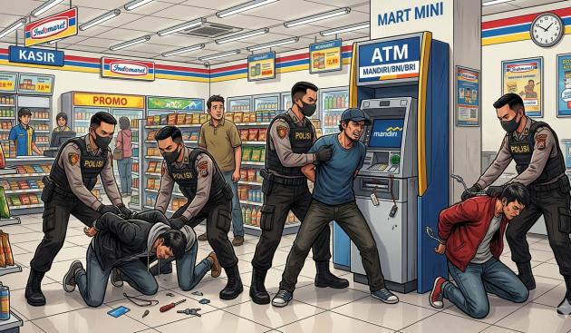 Illustration of ATM jammer theft suspects arrested by police while operating at a minimarket.