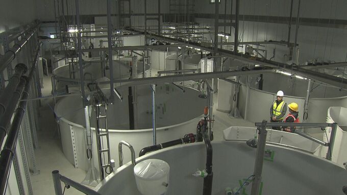 “This is the tank room where the fish first swim after hatching. The tanks are 4.6 meters in diameter and 1.8 meters high. We maintain the optimal water temperature and quality to provide the best environment for the fish.”