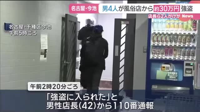 Around 2:20 a.m. on the 20th, four men broke into an adult entertainment business office in Chikusa Ward, Nagoya, and fled after stealing about 300,000 yen. Two people, including the manager, were injured, and police are investigating the incident as a robbery resulting in injury.