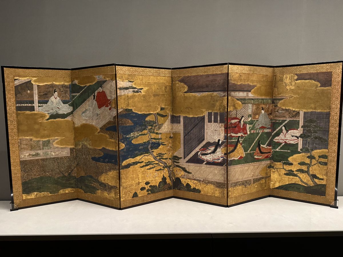 Chapter One is “Art of Stories: Displaying Narratives,” featuring narrative art such as Buddhist paintings, secular paintings, and crafts.“The Tale of Genji Screen,” Momoyama period, 16th–17th century, Osaka City Museum of Fine Arts, First Half