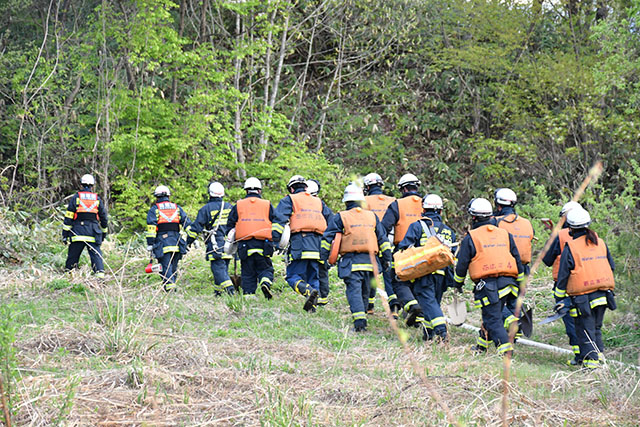 Firefighters from the Nishimurayama Wide Area Administrative Affairs Association Fire Department head to a forest fire scene at 5:34 a.m. on the 23rd in Oe Town.