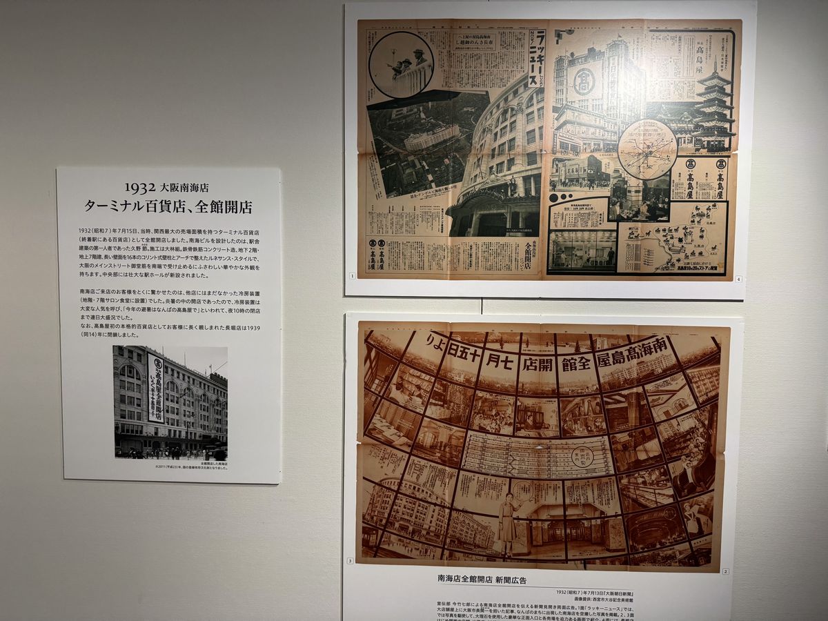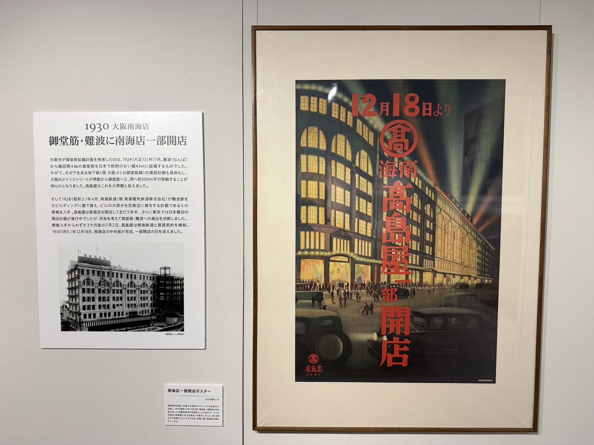 This is a poster from when business resumed after the Great Kanto Earthquake of 1923, using the borrowed Chiyodakan hall in Chiyoda Ward.This poster announces the Grand Opening Sale for the newly completed Takashimaya Kyobashi store. According to explanations, the “mannequin” written on the poster referred to fashion models at the time.This is a poster for the Takashimaya Nankai store, which partially opened in 1930. It is explained that the night scene was drawn to appeal to customers with its business hours extending until 10 PM.This is a newspaper advertisement from when the Takashimaya Nankai store opened its entire building.This is a poster from the opening of the Takashimaya 10-Sen Store (Ten-Sen Store) in 1931.This is a poster for the Centennial Anniversary Grand Sale held in 1931, marking 100 years since the company’s founding in 1831.This is a poster for the Takashimaya Nipponbashi store, which opened in