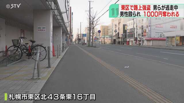 Around 1:15 AM on April 23, a robbery occurred on a sidewalk in Higashi Ward, Sapporo, where five to six men in their teens to twenties assaulted a 31-year-old man they did not know, punching and kicking him, and threatening him with “Would you rather be killed or pay up?” before stealing 1,000 yen in cash. The men then fled on foot northward.
