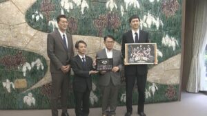 San-en Neophoenix Basketball Players Visit Governor Omura to Report Regional Championship Victory and Advocate for Participation in Referendum on New Arena in Aichi