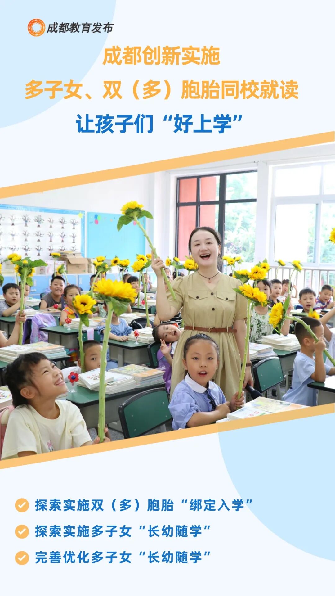 В январе 2021 года, основываясь на политике «привязанного зачисления» для близнецов, Чэнду начал исследовать подход «обучение братьев и сестёр в одной школе». Эта политика распространяется как на государственные, так и на частные школы и применяется ко всем постоянным жителям, позволяя подавать заявления как местным детям, так и детям мигрантов. Это эффективно решает транспортные проблемы, смягчает родительские тревоги и снижает нагрузку на семьи.