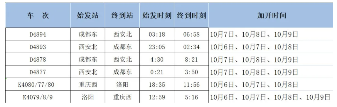 Кроме того, для популярных туристических направлений, таких как Цзючжайгоу и Хуанлун, 7 октября добавлен поезд C5804 от Хуанлун Цзючжайгоу до Восточного Чэнду для удобства обратных поездок.