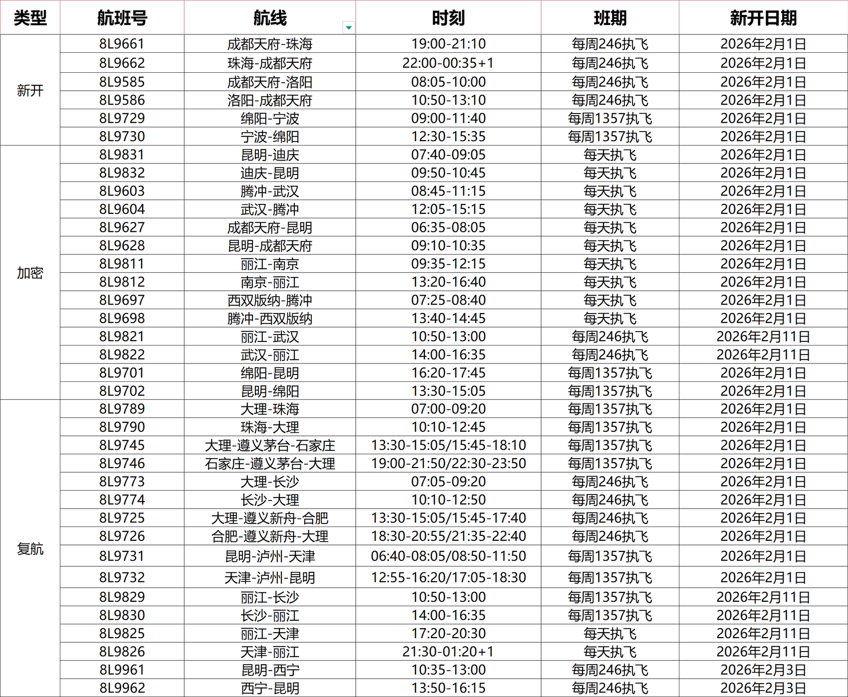 Весенний транспортный пик 2026 года вот-вот начнётся. С 1 февраля авиакомпания Lucky Air запустит новые прямые рейсы из Чэнду Тяньфу в Чжухай и из Чэнду Тяньфу в Лоян, которые будут выполняться по вторникам, четвергам и субботам. Новый маршрут из Мяньяна в Нинбо будет работать по понедельникам, средам, пятницам и воскресеньям. Кроме того, будет увеличена частота полётов на семи популярных туристических направлениях, включая Куньмин — Чэнду Тяньфу, Куньмин — Дицин, Тэнчун — Ухань и Лицзян — Нанкин, которые станут ежедневными. Частота рейсов на маршруте Куньмин — Мяньян будет увеличена в зависимости от спроса пассажиров и будет работать по понедельникам, средам, пятницам и воскресеньям, создавая гибкую сеть для обеспечения транспортной доступности как перед праздниками, так и после них. Возобновлённые маршруты призваны удовлетворить двойной спрос на «возвращение домой» и «путешествия», включая специальные маршруты, такие как Куньмин через Лучжоу в Тяньцзинь, которые будут работать по понедельникам, средам, пятницам и воскресеньям.