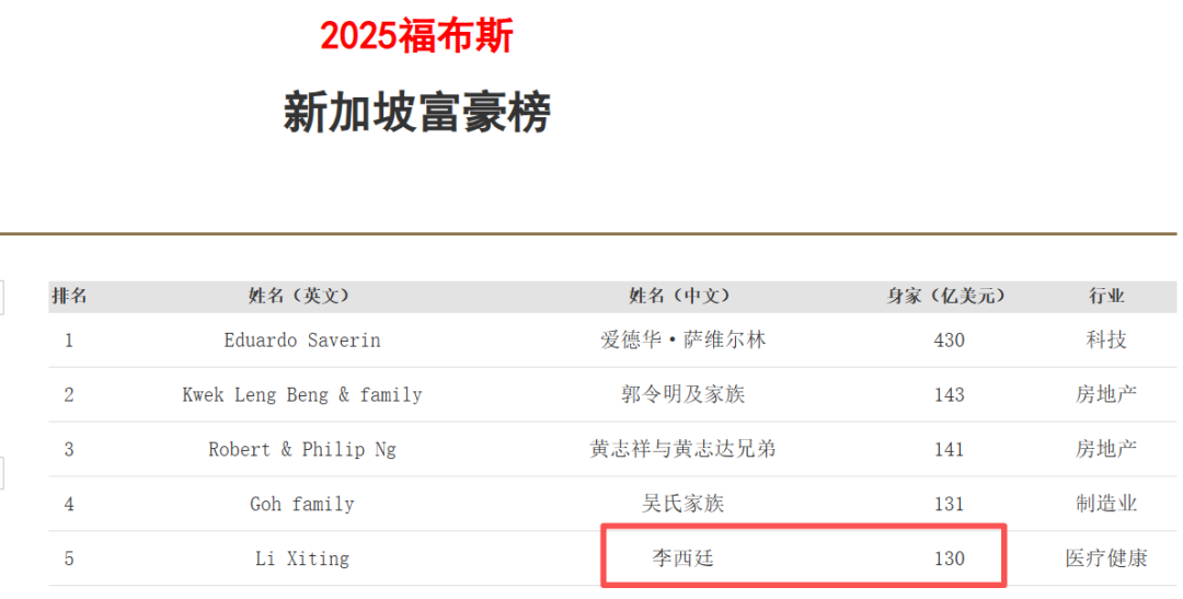 В рейтинге богатейших людей Сингапура по версии Forbes за 2025 год он занял 5-е место с состоянием в 13 миллиардов долларов.