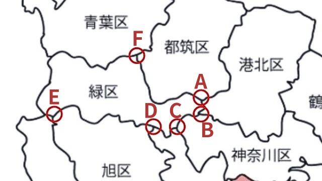 В этот раз мы исследуем 6 точек, где сходятся границы Мидори + 2 других районов, по порядку от A.