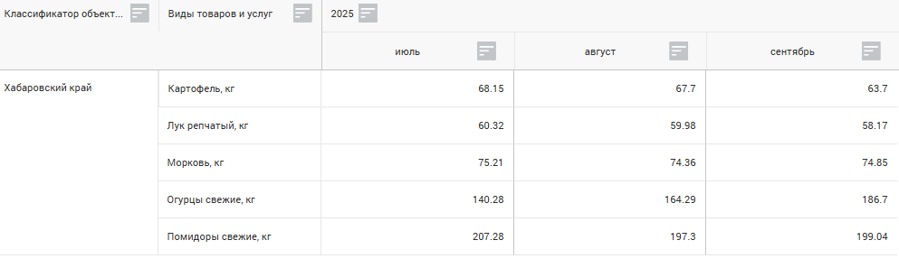 A study was conducted on the vegetable situation in Khabarovsk stores. Here is the statistics for our region over the past three months. There is no data for October yet, but the changes are already visible. Interestingly, cucumbers have indeed become more expensive, while tomatoes, according to Khabarovskstat data, have become cheaper.