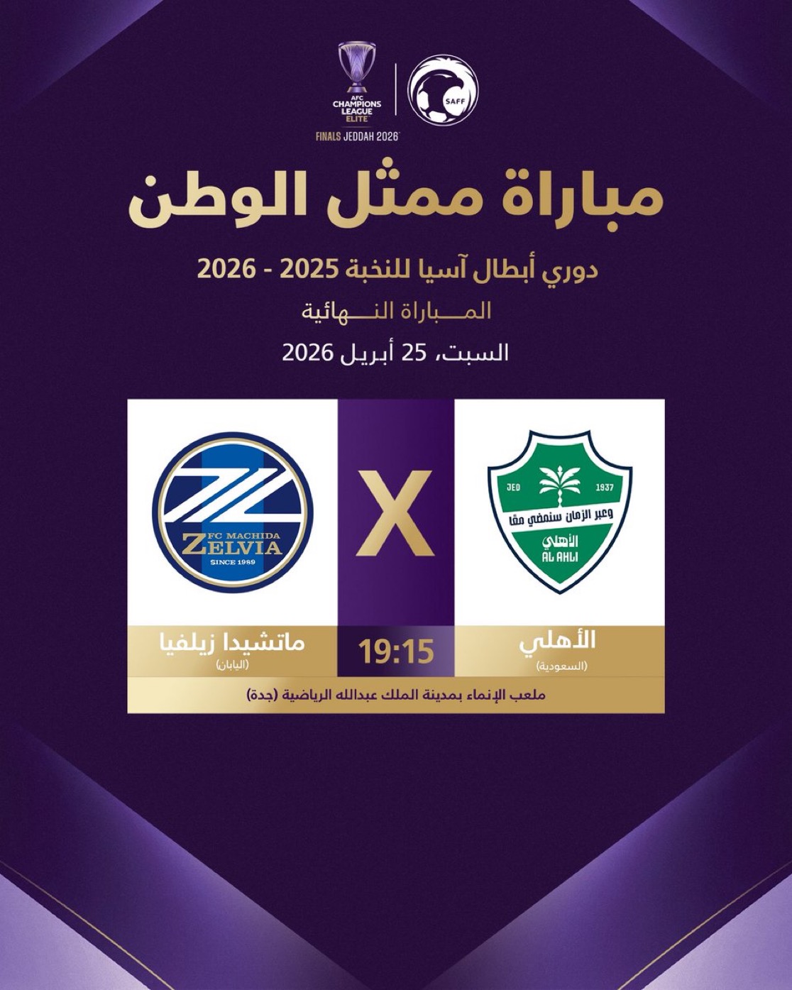 The eyes of Asian football fans are turning to the anticipated match between Saudi Arabia’s Al-Ahli and Japan’s Machida Zelvia, in the final of the AFC Champions League Elite, which takes place this evening, Saturday, April 25, 2026.