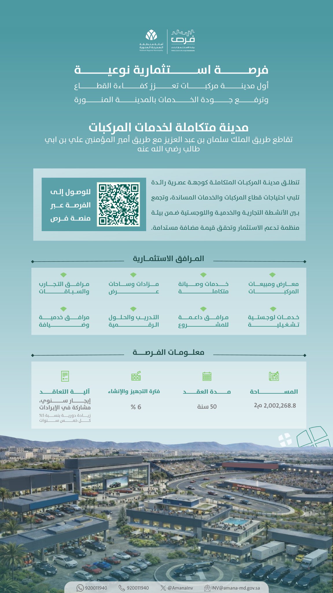 The Medina Region Municipality has introduced a major investment opportunity to establish, operate, and maintain an integrated vehicle services city, as part of efforts to enhance operational efficiency and service quality, aiming to improve user experience and support a vital sector in the region. The city is located at the intersection of King Salman bin Abdulaziz Road and Prince of the Believers Ali bin Abi Talib Road, covering an area exceeding two million square meters, with a contract duration of up to 50 years, in an operational model combining commercial, service, and logistics activities within an organized and investment-friendly environment. Through this opportunity, the municipality aims to create a modern, integrated destination that meets the needs of the vehicle and support services sector, delivering sustainable added value by providing a comprehensive system including vehicle showrooms and sales, integrated maintenance services, auctions and display areas, along with testing and racing facilities, operational logistics services, and supporting facilities such as training and digital solutions, in addition to service and hospitality amenities. The contracting mechanism is based on an annual lease system with revenue sharing, including a periodic increase of 5% every five years. The total project area is 2,002,268 square meters, with a designated preparation and construction period according to specified ratios. Investors are invited to review the opportunity details and apply through the “Opportunities” platform.