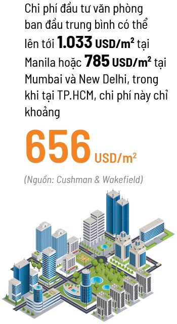 A director from the Leasing Department at Cushman & Wakefield Vietnam noted that Vietnam has a competitive advantage in attracting Global Capability Centers (GCCs). Vietnam also has a more competitive initial investment cost compared to India and the Philippines. According to a Cushman & Wakefield report, the average initial office investment cost can be up to $1,033/m² in Manila or $785/m² in Mumbai and New Delhi, while in Ho Chi Minh City, this cost is only about $656/m².
